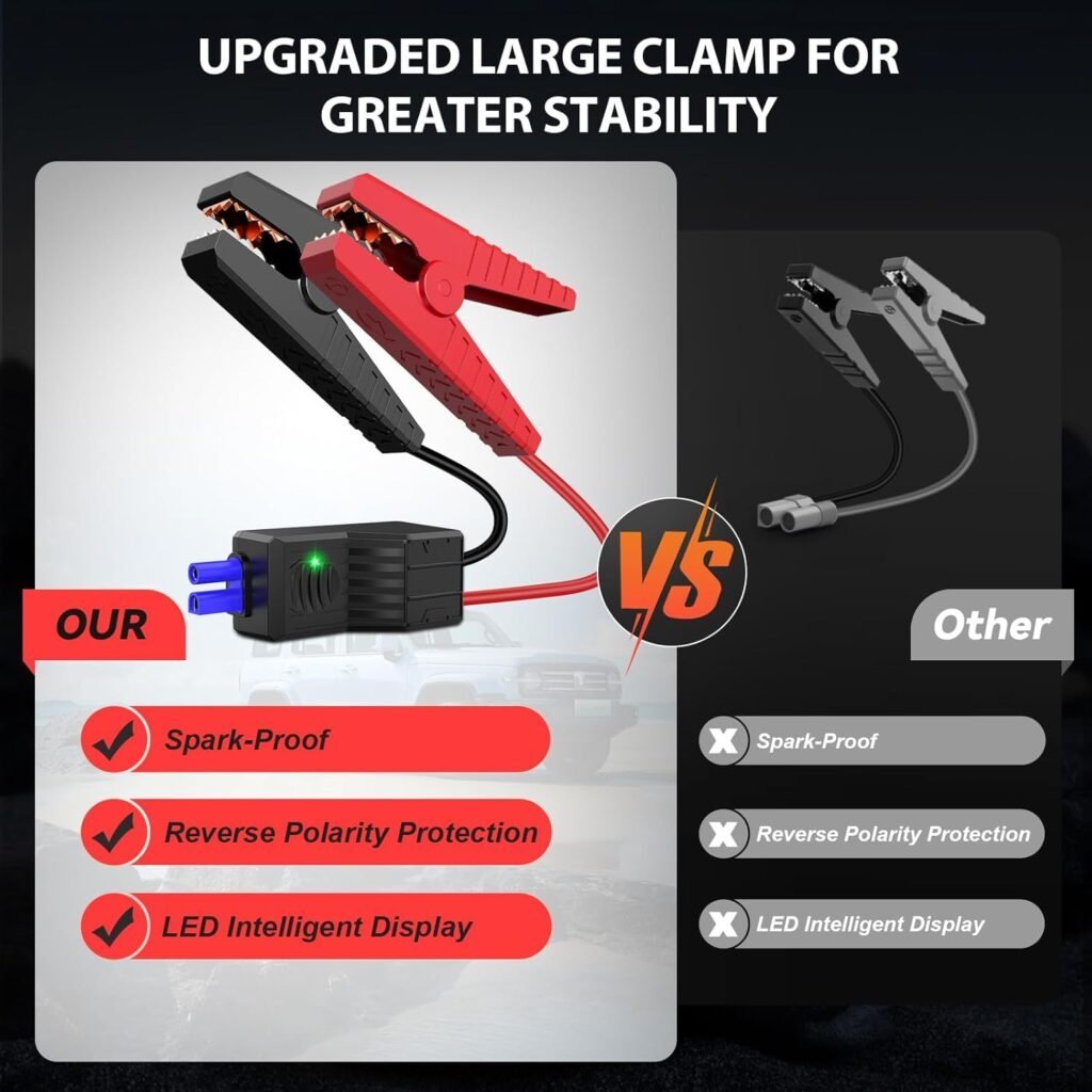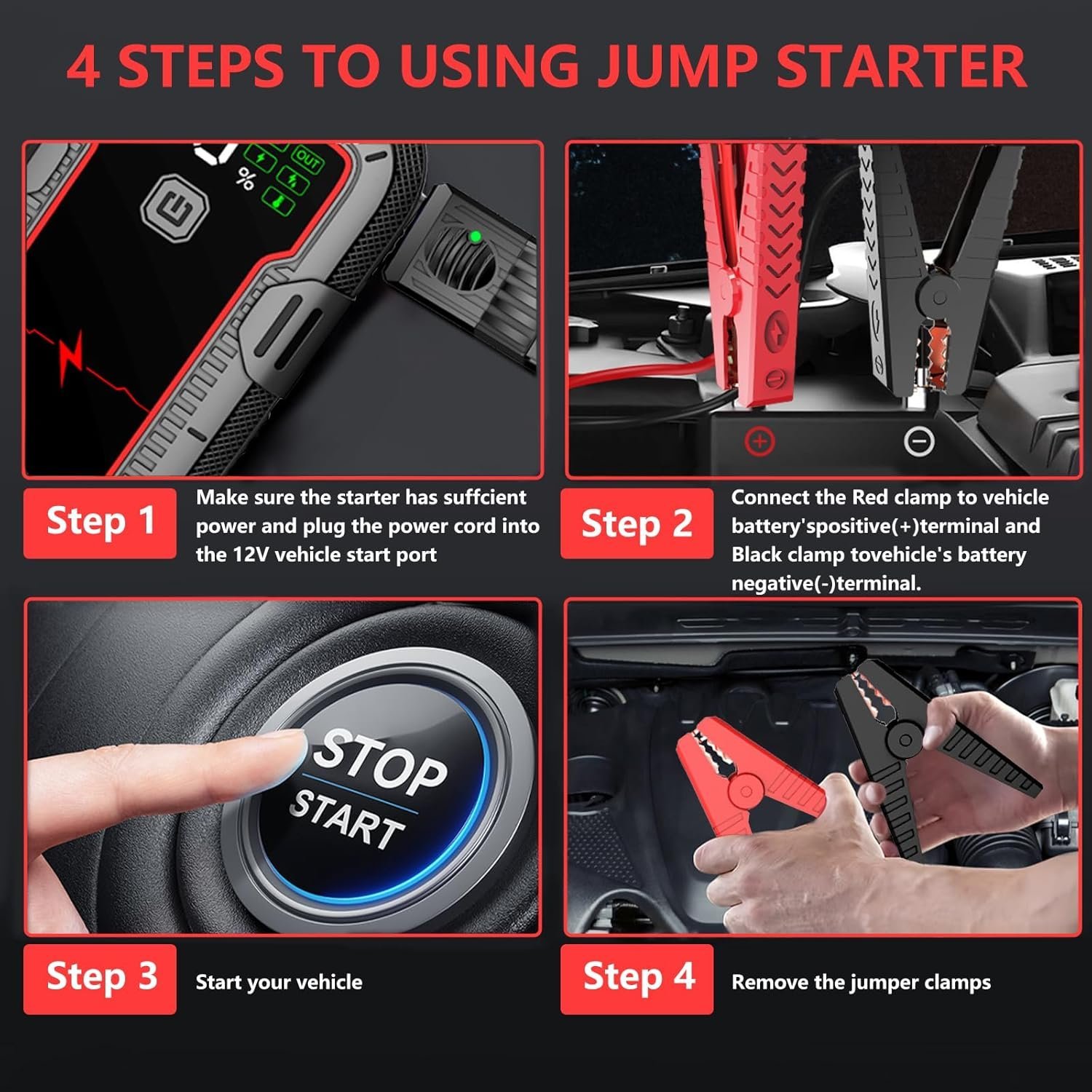 • Smart Safety Shield: Experience peace of mind with advanced safety features including spark-proof technology, reverse polarity protection, and temperature controls. This car starter battery pack intuitively safeguards against misconnections with warning buzzes and flashing alerts, making jump-starting a breeze even for novices.