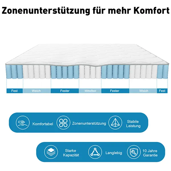 CHICASA Taschenfederkernmatratze – Luxuriöse 7-Zonen Matratze, hoher Komfort, H3/H4, 10 Schichten, 25 cm Höhe